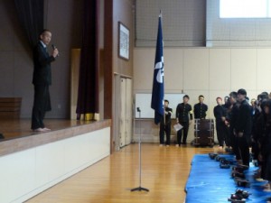 校長先生と応援団長のあいさつの後、 校歌、角盤山、曙光に輝く、若き血潮、春撩乱を全校生徒で歌いました。