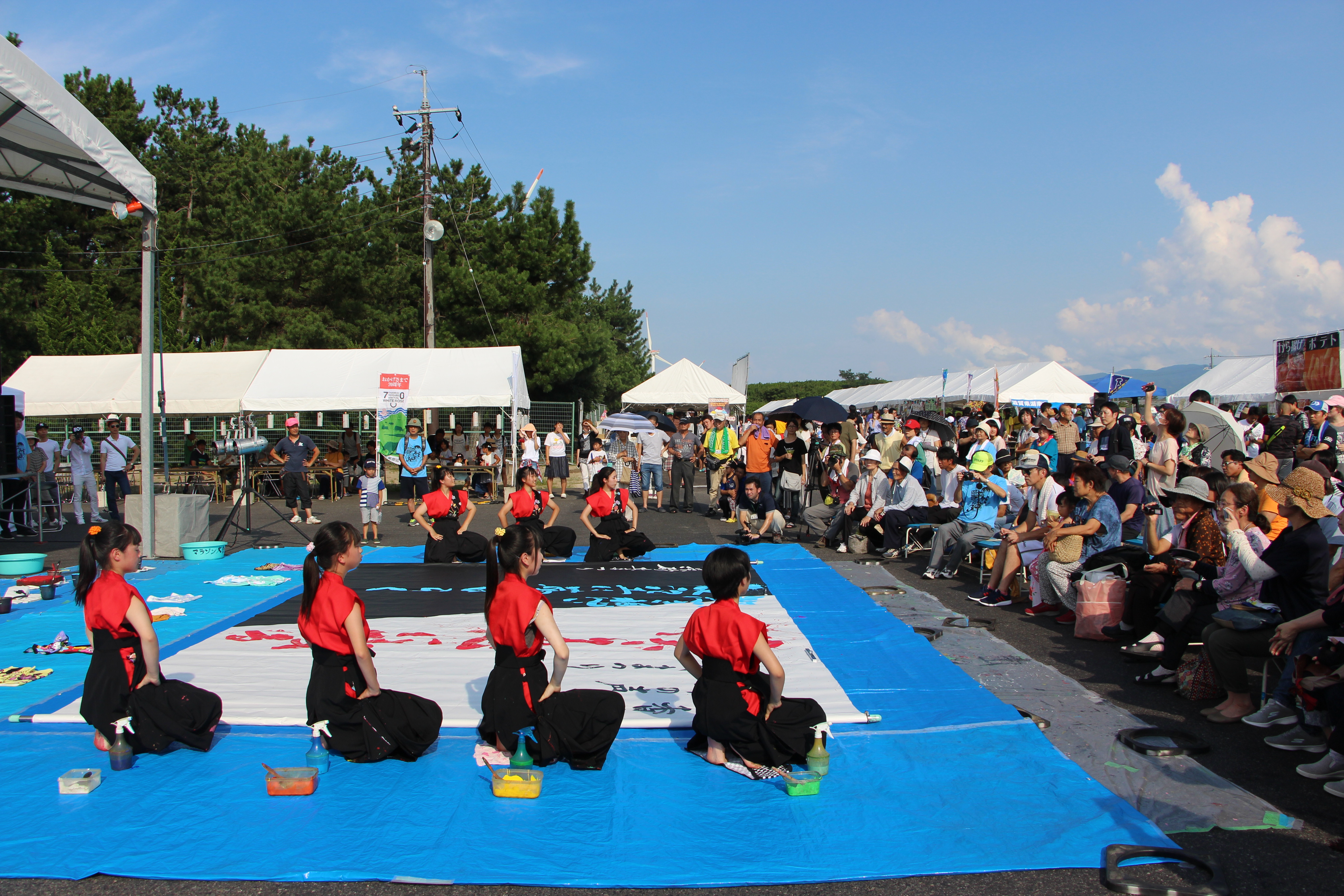 8月20日(日)恒例の第12回「北栄砂丘まつり」が開催されました。本校書道部は今年も4年連続でオープニングイベントに参加し、多くの観衆の前で書道パフォーマンスを披露しました。